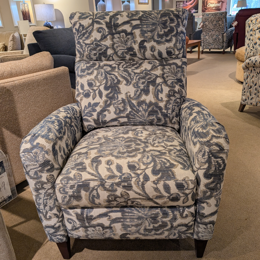 High Leg pushback recliner in a blue pattern. Dimensions: 32'w X 36'd X 43'h