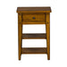 Accent your space with the casual country style Lake House chair side table. Crafted of poplar solids and oak veneers, this piece features an appealing planked top, two open planked shelves, simplistic wood and peg accents, one drawer accented by antiqued brass knob hardware, anchored by a tapered leg design. The golden oak finish allows for a universal appeal.