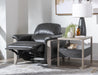 A 3-piece high-leg sofa group with a tastefully integrated pull-down console with drink holders/USB charging. These "transformers" are hidden and have the look of a luxury car feature. Also included is a wood console with swivel table and two 18 inch fabric accent pillows.