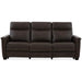 Treat yourself to high style and superior comfort with Crawford's triple power off-the-floor traditional design. Crawford includes power motion recline, a comfort-high back with power headrest, and power lumber support. Designed to emulate a stationary aesthetic, the silhouette features a fully finished back frame for 360-degree visual appeal. The slender flared arm design that is further embellished with head-to-head decorative nail trim creates an overall scale suitable for small living spaces. Additional features include a drop-down table in the center back of the sofa with a hard surface, cup holders, and USB & USB-C charging ports. Crawford is available in a selection of semi-aniline leather/match applications with heavy grain texture and subtle two-tone coloration that's finished for active family environments. Let Crawford become the focal point of your living space, where relaxation meets modern technology in perfect harmony.